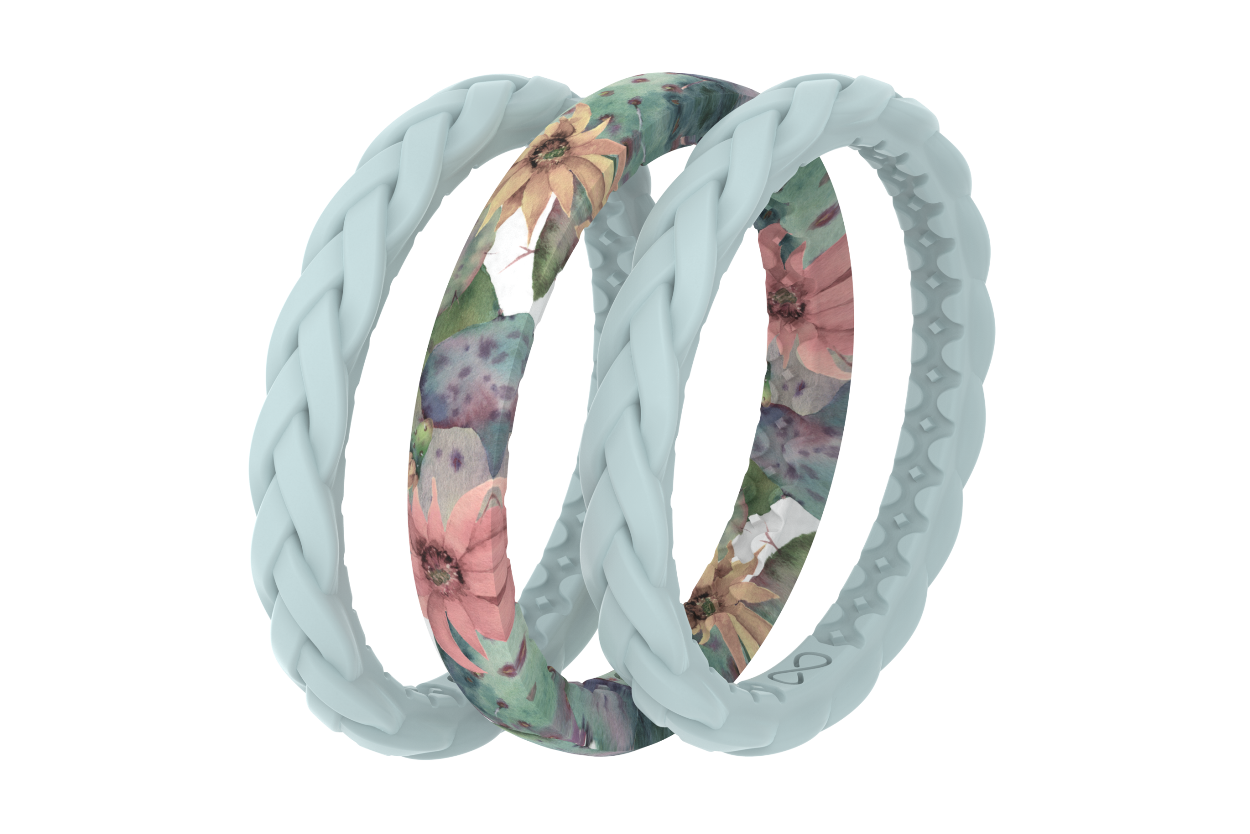Venture out west with our Cactus Bloom stackable rings. This light. airy trio will transport you to an open air desert oasis. Our popular Cactus Bloom ring. featuring sage-toned cacti with flowering pink and sunny yellow blossoms. paired with two of our light blue braided rings completes this gorgeous trio.