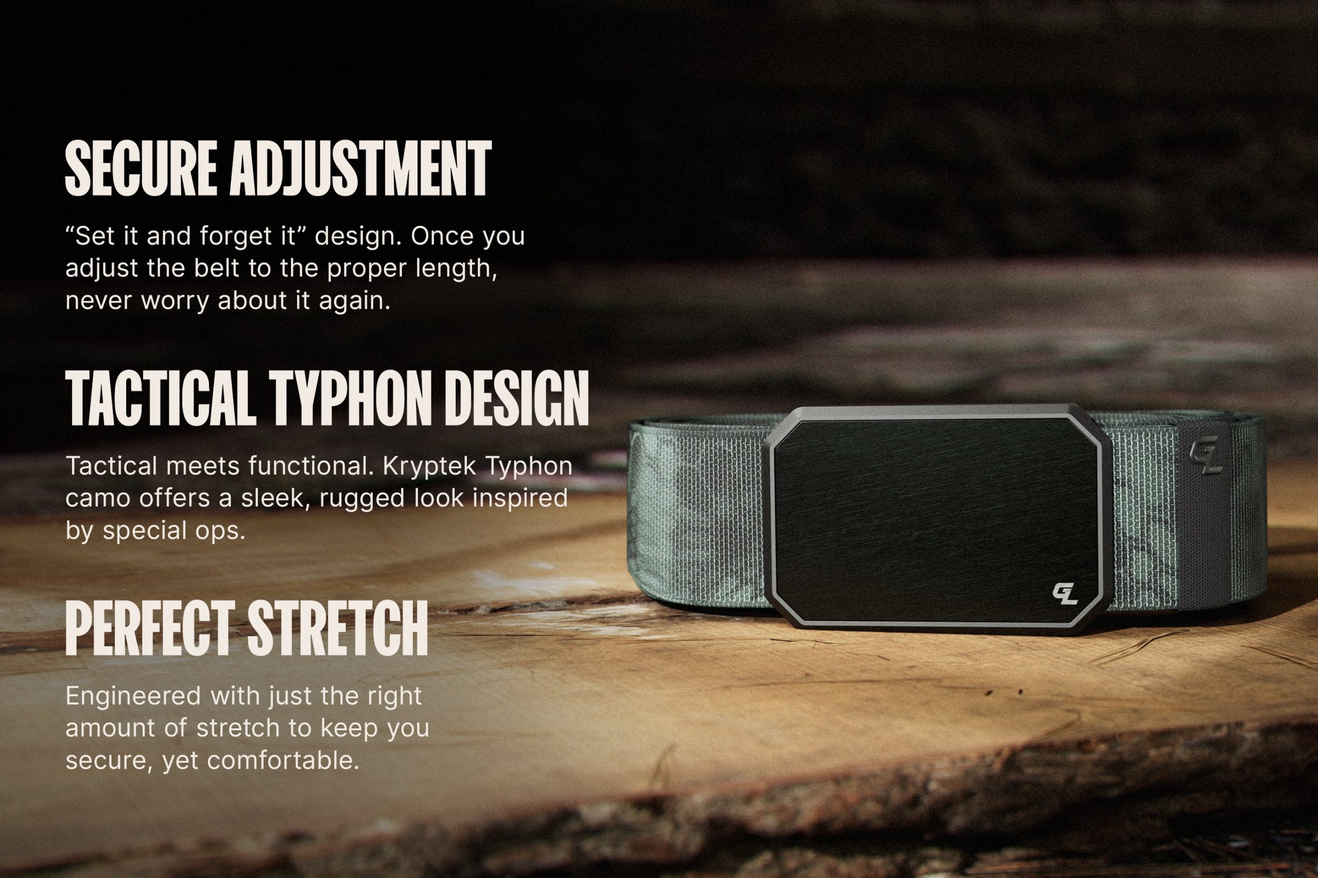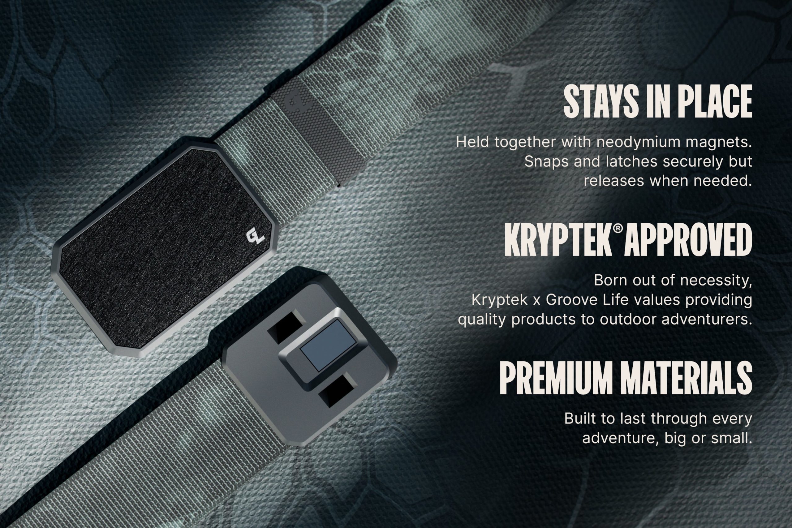 With a sleek. tactical Kryptek Typhon™ camouflage pattern inspired by special ops. this Groove Belt® is perfect for those who want their gear to stand out while staying functional. From battlefield to backcountry®. Kryptek values the best apparel and is a match for the high standards of our Groove Belt. Built with our signature no-flap. magnetic buckle design. this adjustable camo belt can hold up to any adventure. whether you’re at the shooting range. or just heading out for a night on the town.