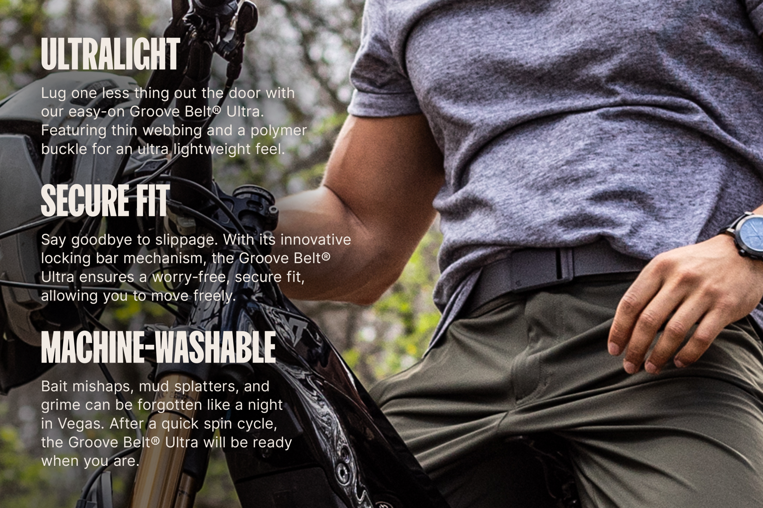 The Groove Belt® Ultra is the most lightweight. durable. and versatile belt you’ll ever own. Featuring a no-slip locking bar mechanism. curved polymer buckle. and thin webbing to provide a secure and lightweight feel. Machine-washable and perfect for the weekend warrior. Blend comfort. style. and strength as you transition seamlessly from the office to the outdoors. The Groove Belt® Ultra is an adjustable. durable belt ready for any adventure. ensuring all-day comfort so you don’t have to slow down. Assembled right here in the USA and backed by our 94-Year No BS Warranty. Groove Life®. Built for Adventure™.