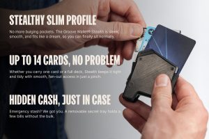 Bold without being loud. the Groove Wallet® Stealth in Gunmetal brings an industrial edge to minimalist carry. Made from ultra-strong aerospace aluminum. it packs serious strength in a smooth. slim frame that slides in and out of your pocket with ease. Whether you’re at work. in the woods. or heading to a weekend cookout. this metal wallet’s sleek profile won’t cramp your style or your jeans. Holds up to 14 cards. includes a hidden cash tray. and eliminates the pinch of bulky leather wallets. Made tough. Built to move. Backed by our Groove Guarantee®.