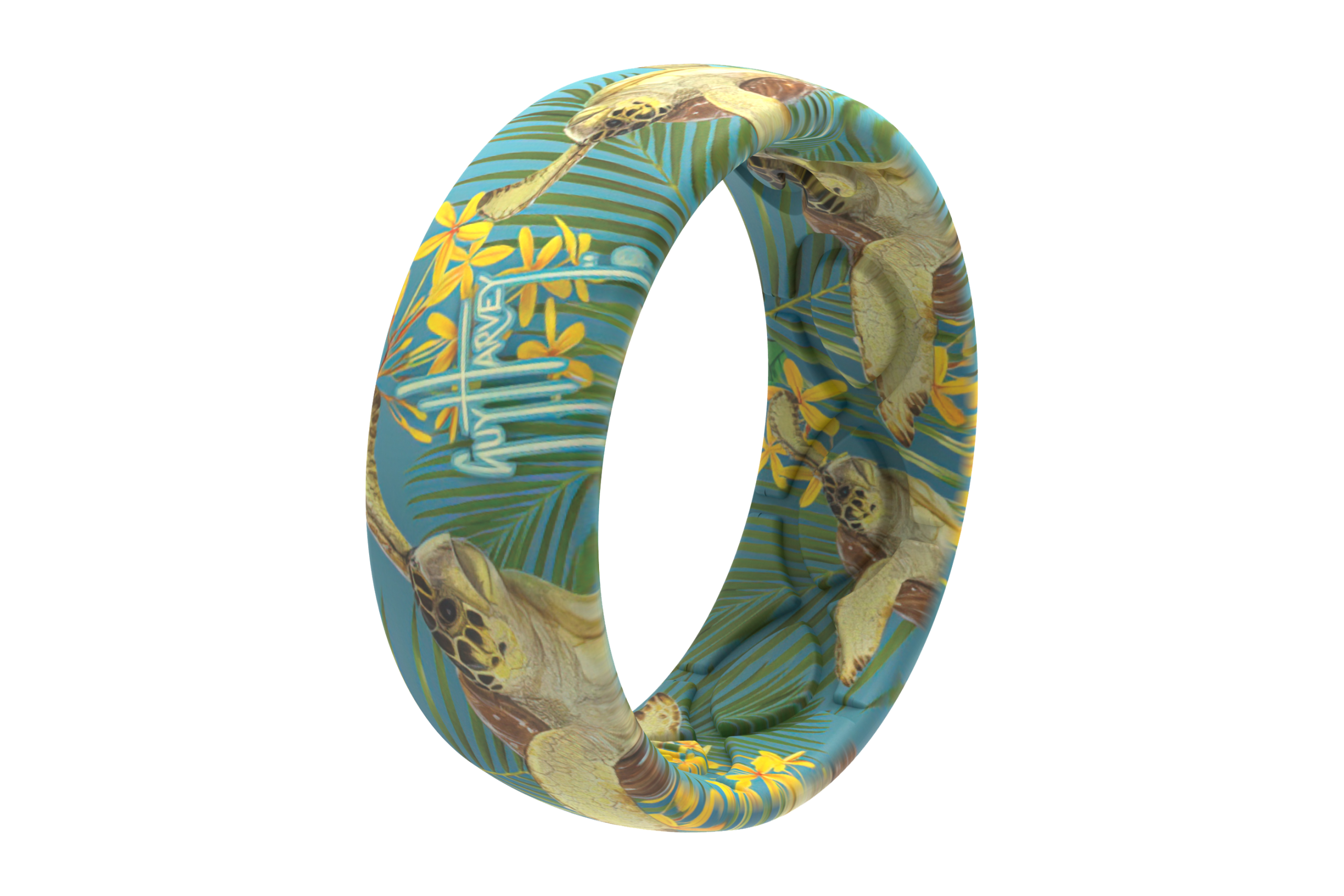You’ll want to book a one-way ticket to paradise with our Guy Harvey® Tropical Turtle Ring. This tropics-inspired ring features olive-green sea turtles against a soft turquoise background. Contrasting ocean palms and sunny. yellow blossoms make this ring the perfect accessory for a day at the beach or for that sunset sail.
